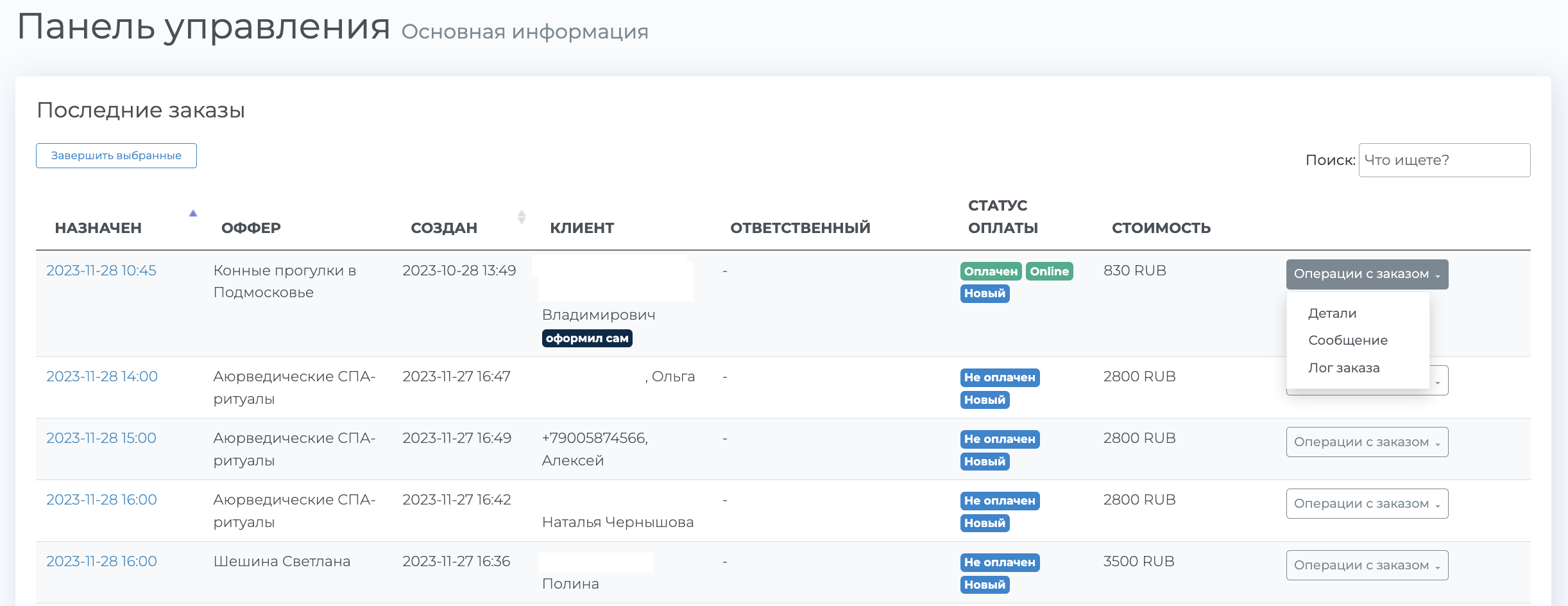 Интерфейс предназначен для просмотра актуальной информации по совершенным или активным заказам в объекте размещения. Просмотр актуальных заказов доступен на главной панели управления CRM а также в разделе “Заказы”