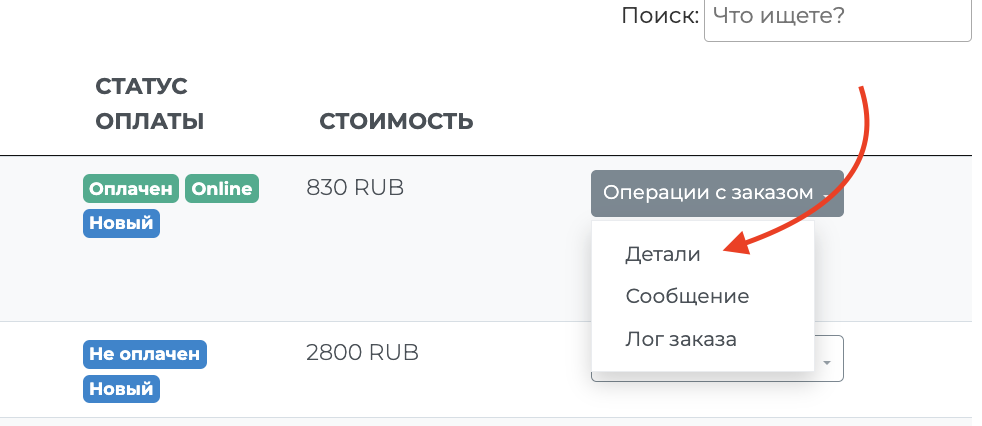 Для перехода в карточку заказа необходимо в интерфейсе просмотра заказов напротив нужного заказа выбрать в контекстом меню пункт “Детали”.