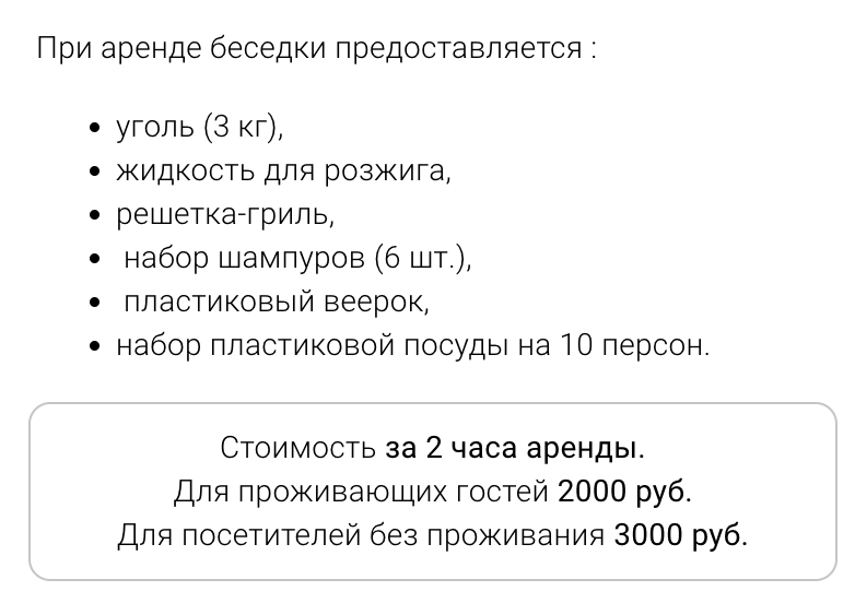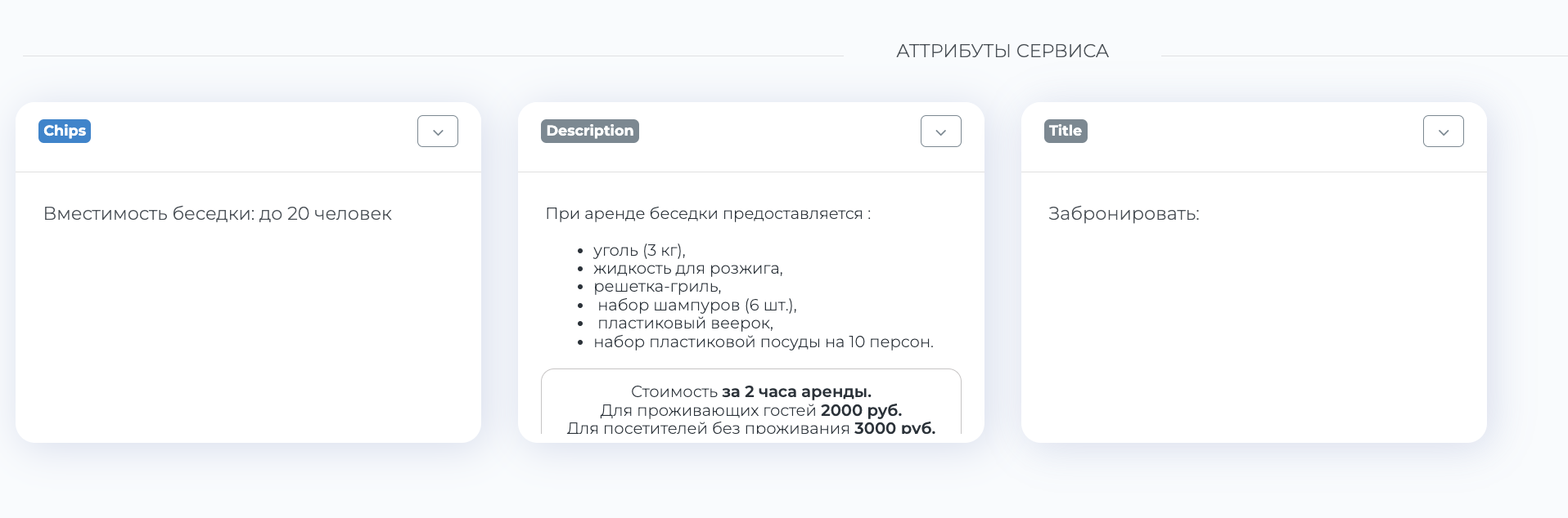 Информационная часть (заголовок, текстовое описание, галерея с картинками, иные информационные блоки, позволяющие гостю понять суть предоставляемой услуги)